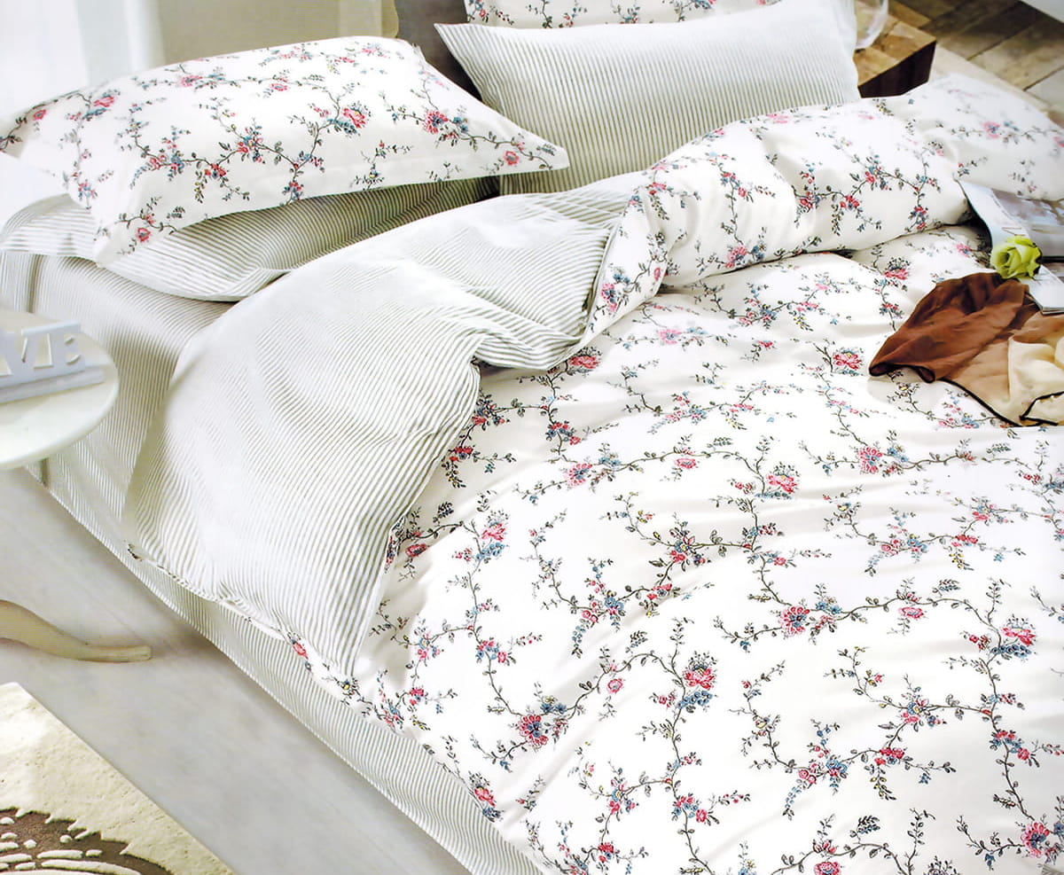 Wzór pościeli: Pościel wzór kwiaty na białym tle. Poszwa na kołdrę jest dwustronna (kwiaty i paski) poszewki są z obu stron w kwiatki.