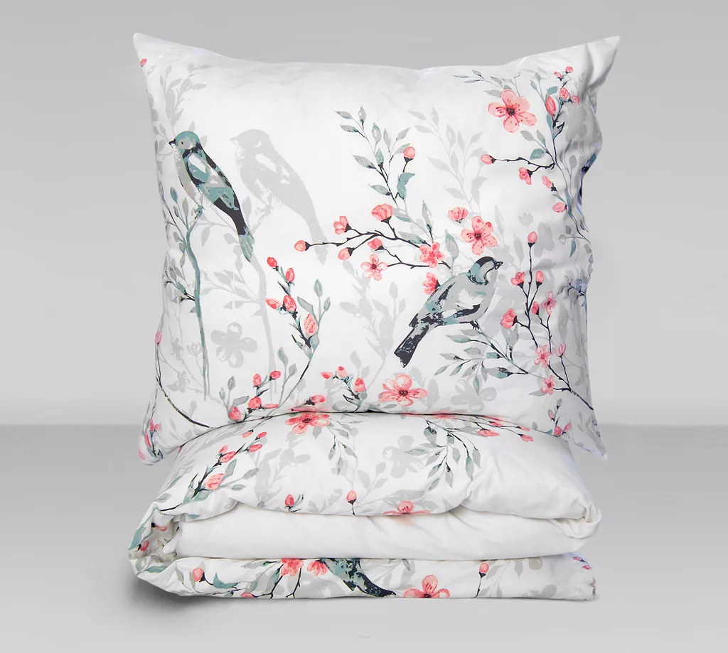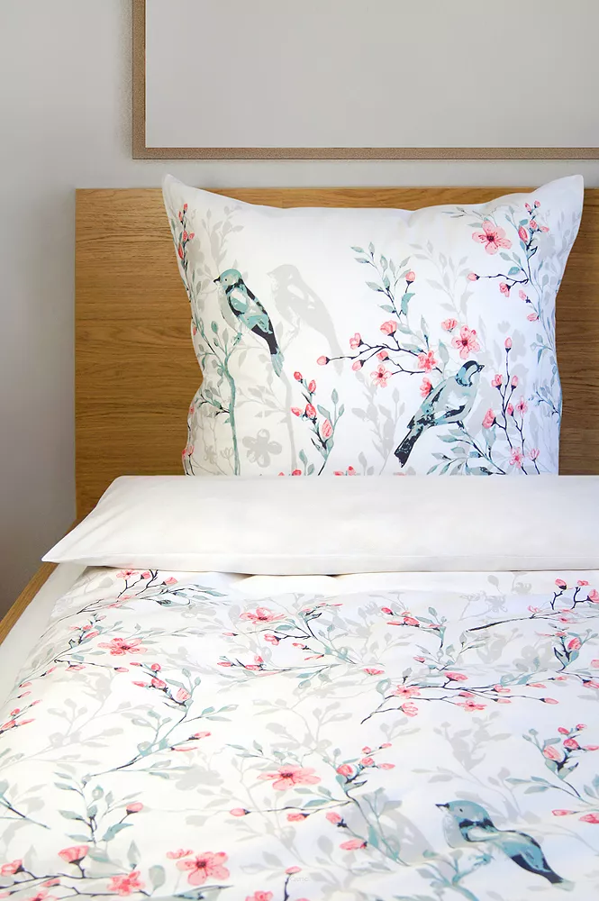Na białym tle rozkwitają gałązki wiśni w kolorze łososiowego różu, a między nimi siedzą dwa ptaki w odcieniu błękitu i granatu. Wzór czerpie z japońskiej estetyki delikatny, spokojny, z nutą wiosny. Szare cienie liści w tle nadają kompozycji głębi bez przytłaczania.