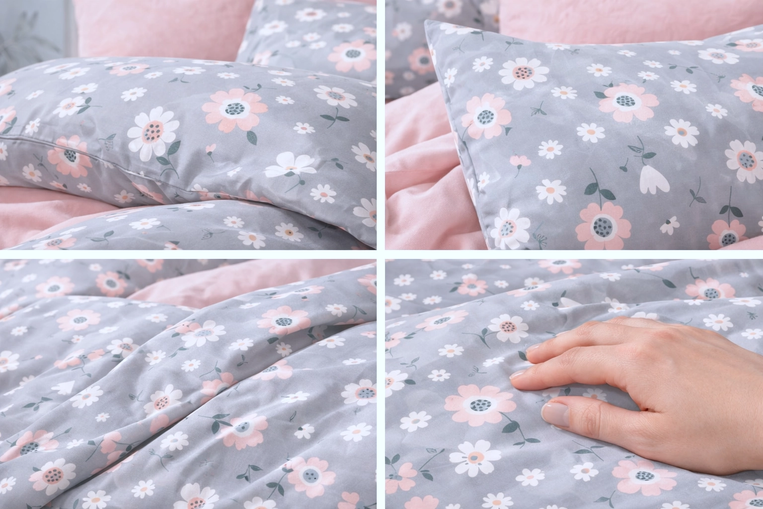 Pościel satyna bawełniana 180x200 w kwiaty szaro różowa