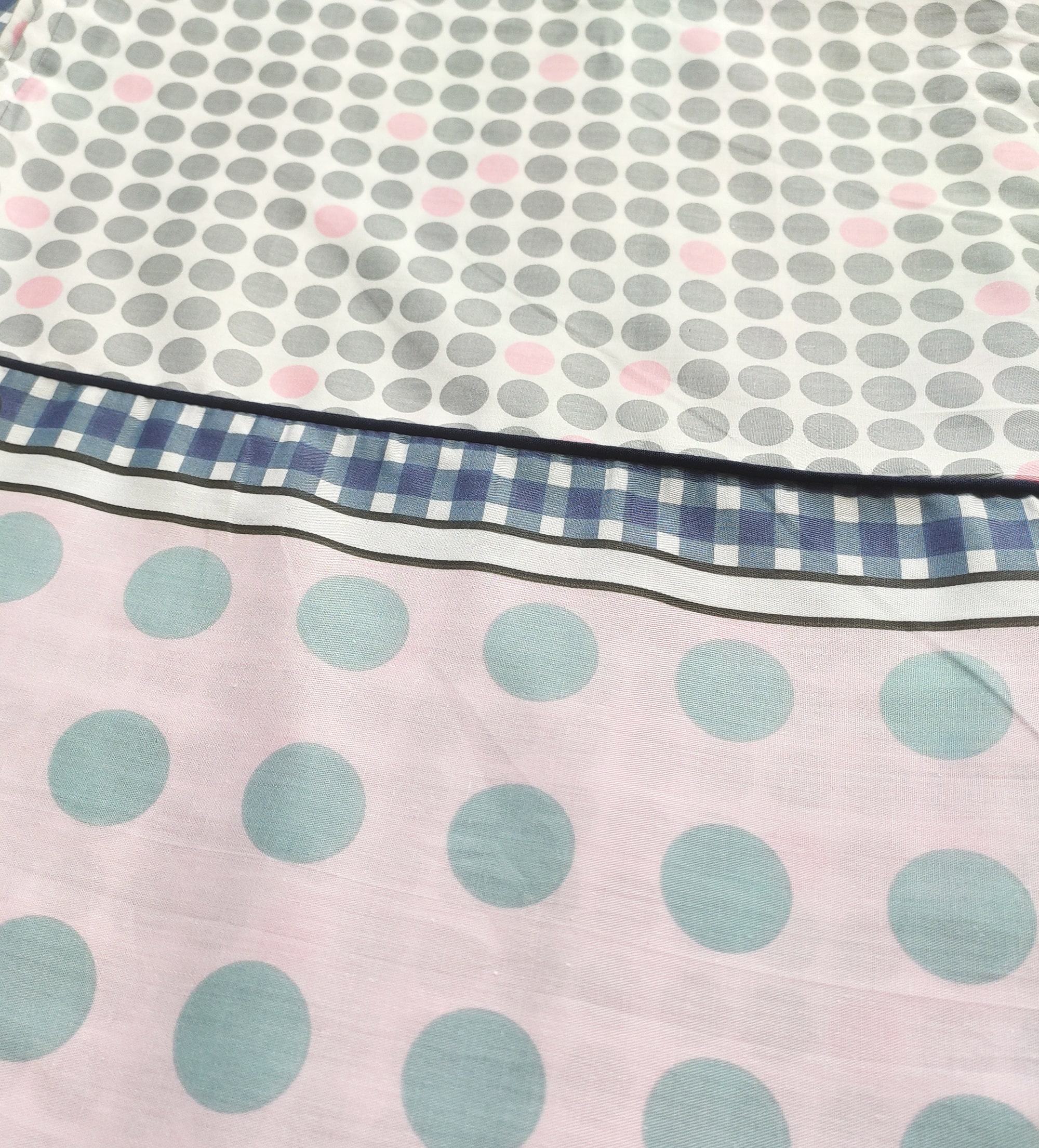 Pościel na zewnętrznej stronie posiada 30 cm pas we wzorze w paski (wzór zachodzi z drugiej strony pościeli) i jest oddzielony lamówką jak na zdjęciu poniżej.