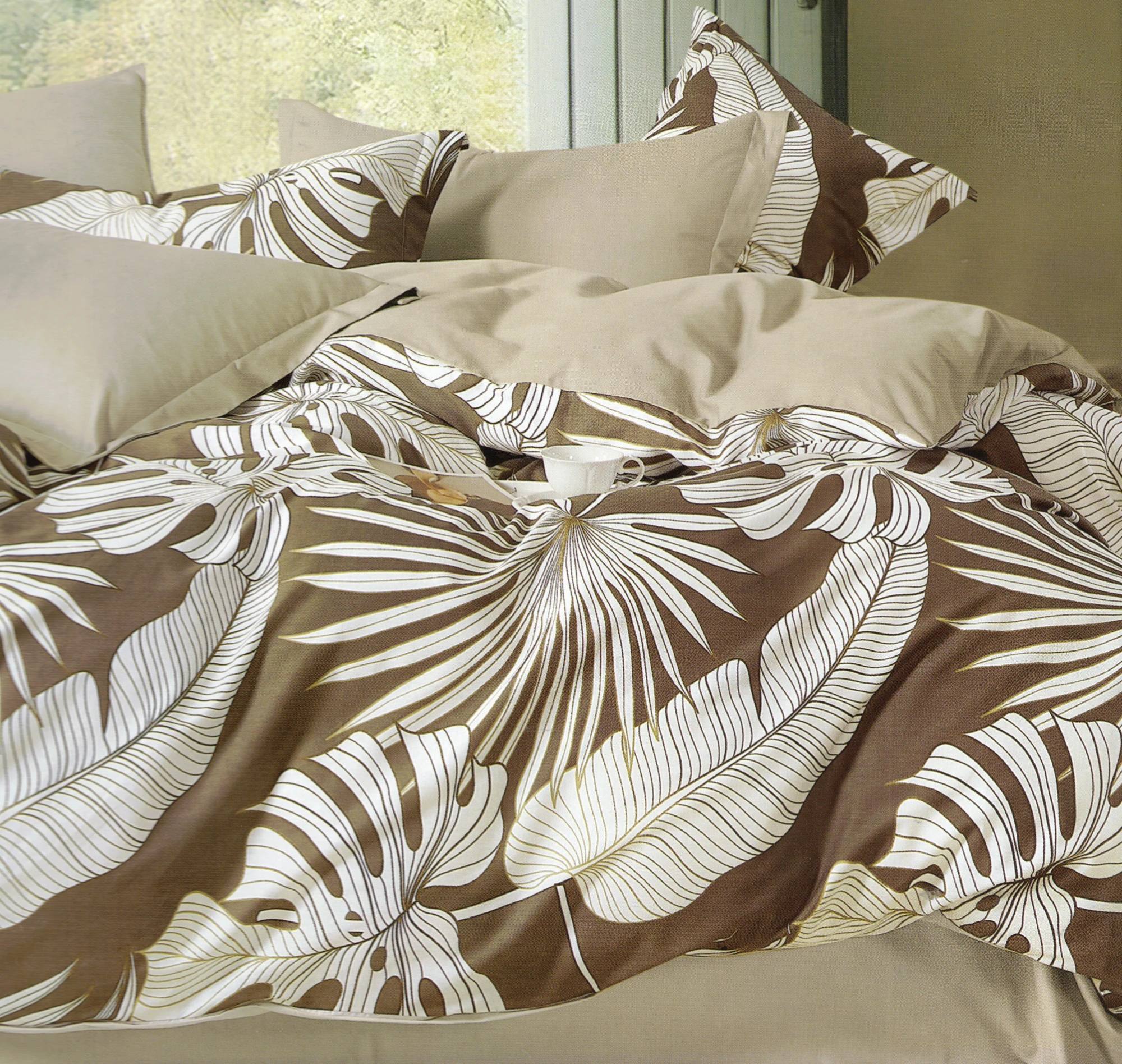 Pościel satyna bawełniana w liście tropikalne czekoladowa dwustronna 200x220 100% bawełna